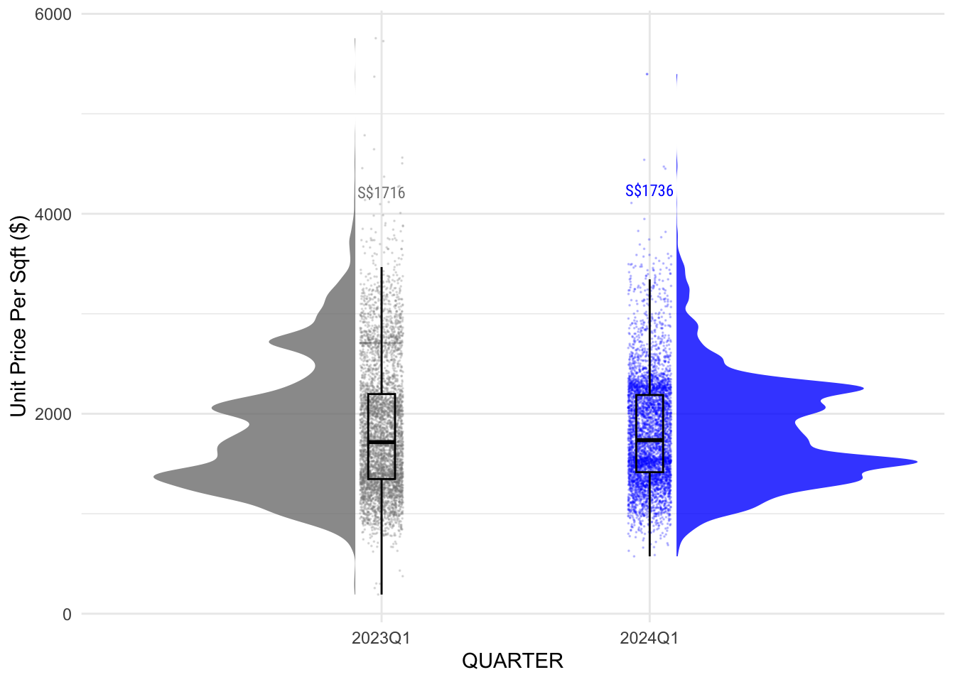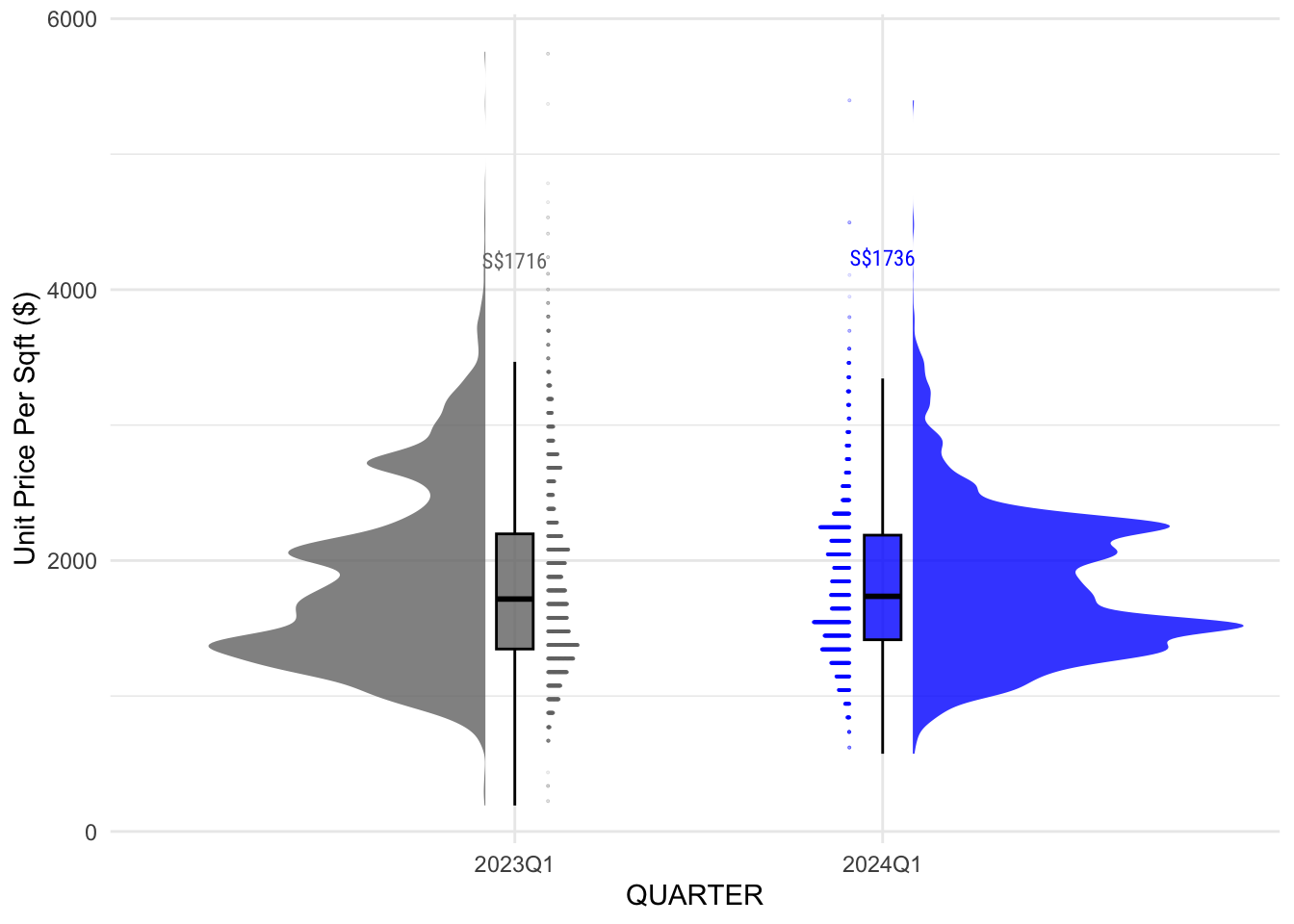 Another very interesting insight is that different property prices experience big variations in prices, while Executive Condominiums have smaller variations. This is because of the more controlled and regulated environment as these properties are under the jurisdiction of HDB. This is why although median prices are at S$1736 in 2024Q1, it is possible to find a more affordable property when looking at Executive Condominiums.