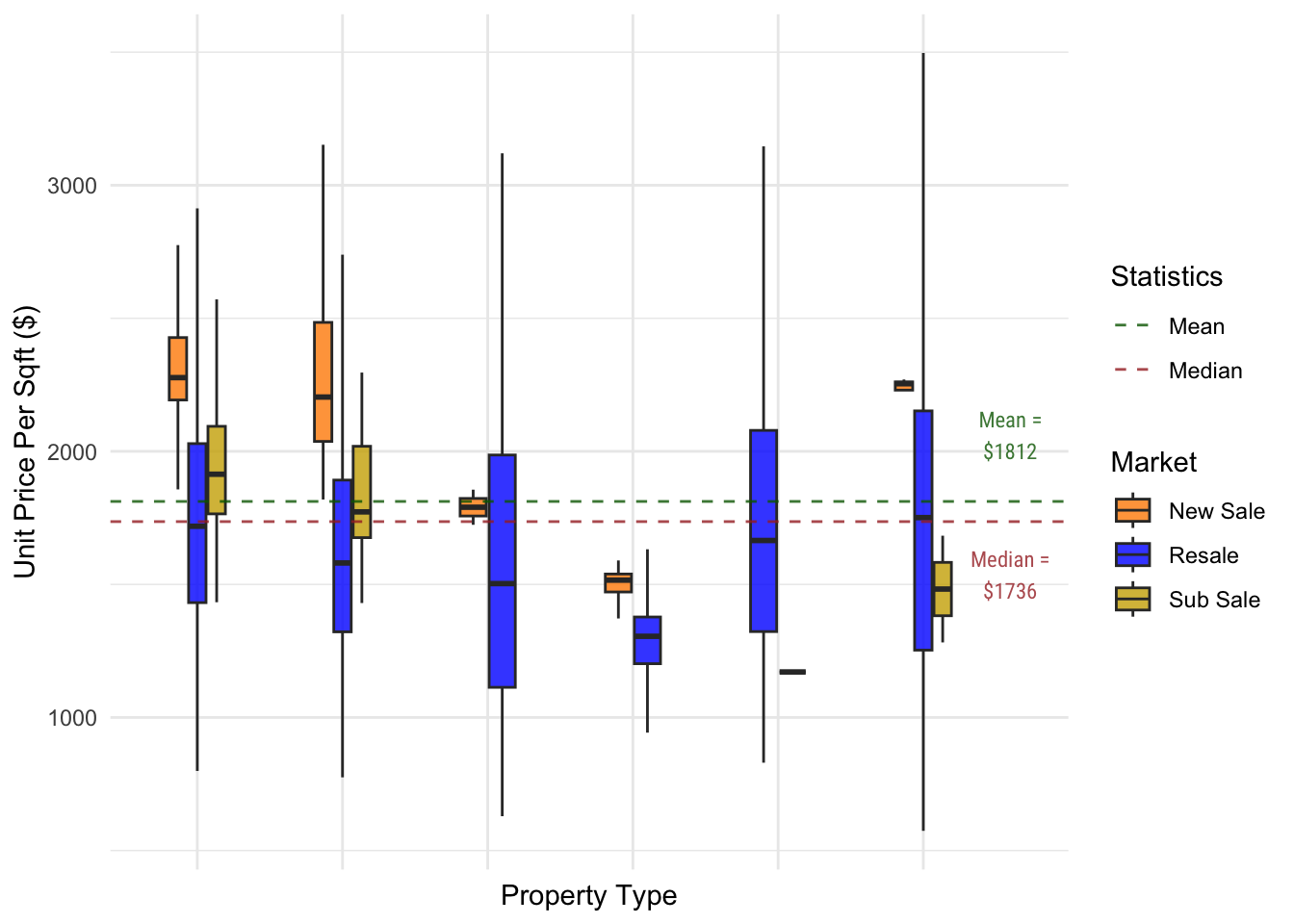 # Generate different boxplots for each market and property type