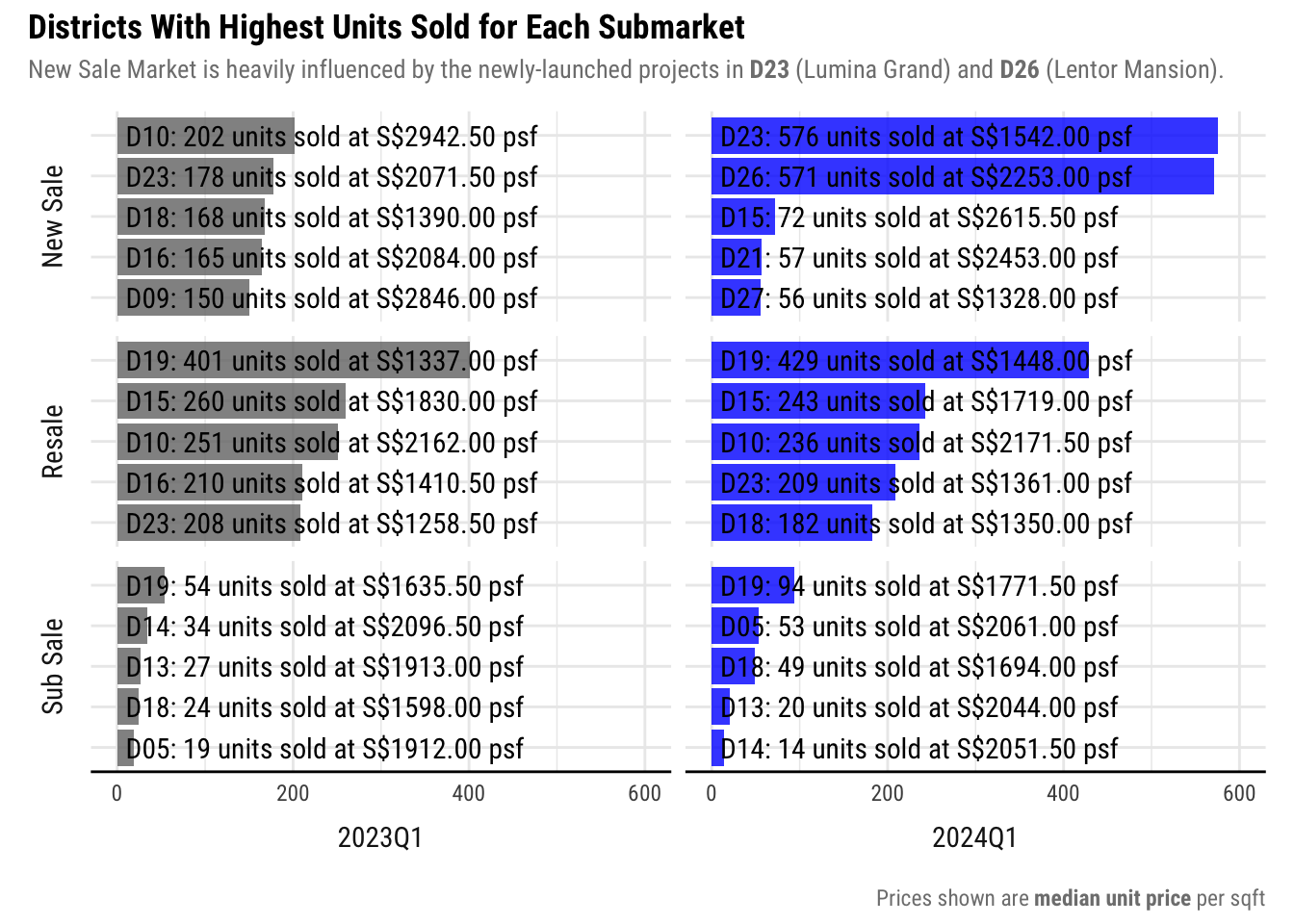 We found that the 2024 New Sales market experienced an sizable decrease is overall prices (7.6%) compared to the same period last year. However, it should be noted that this is due to New Launches located in cheaper districts, compared to the same period last year where that launches where in central districts like 9 and 10.