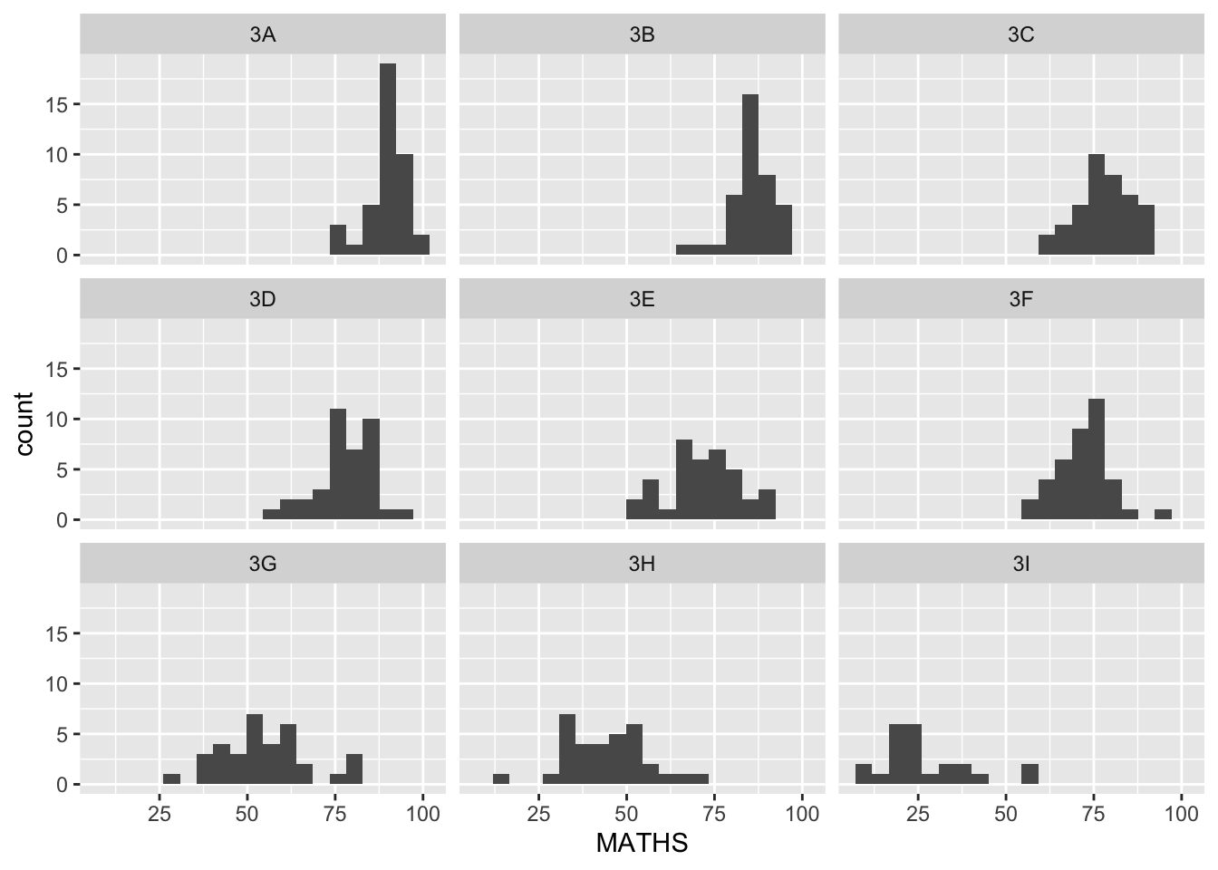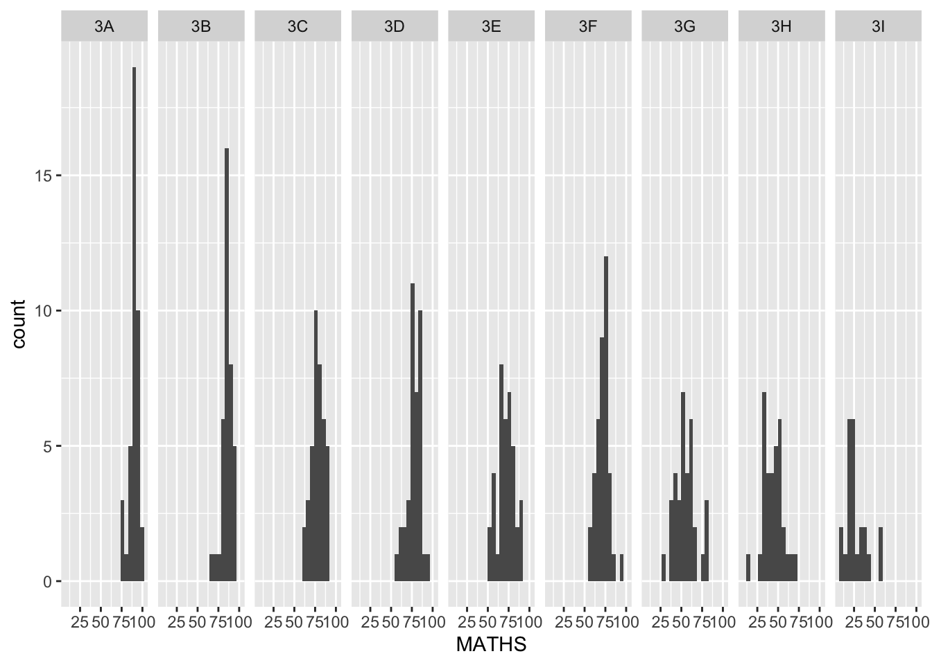 The code chunk below generates multiple histograms for Maths grades for each class.