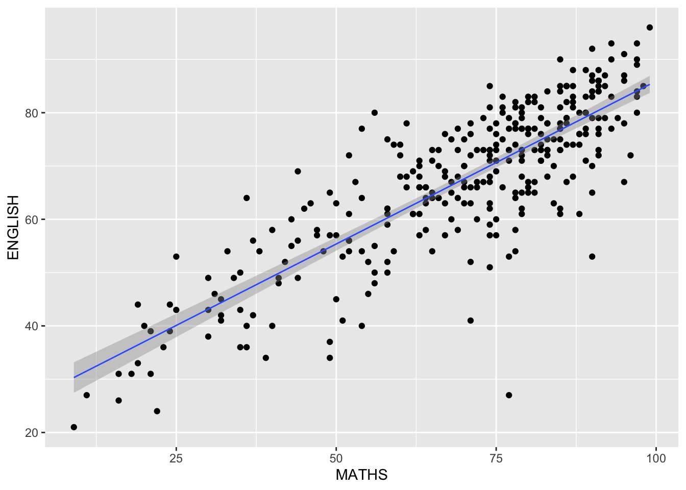 Best fit curve can be generated by using geom_smooth(). We can add this to the English vs Maths scatterplot previously generated.