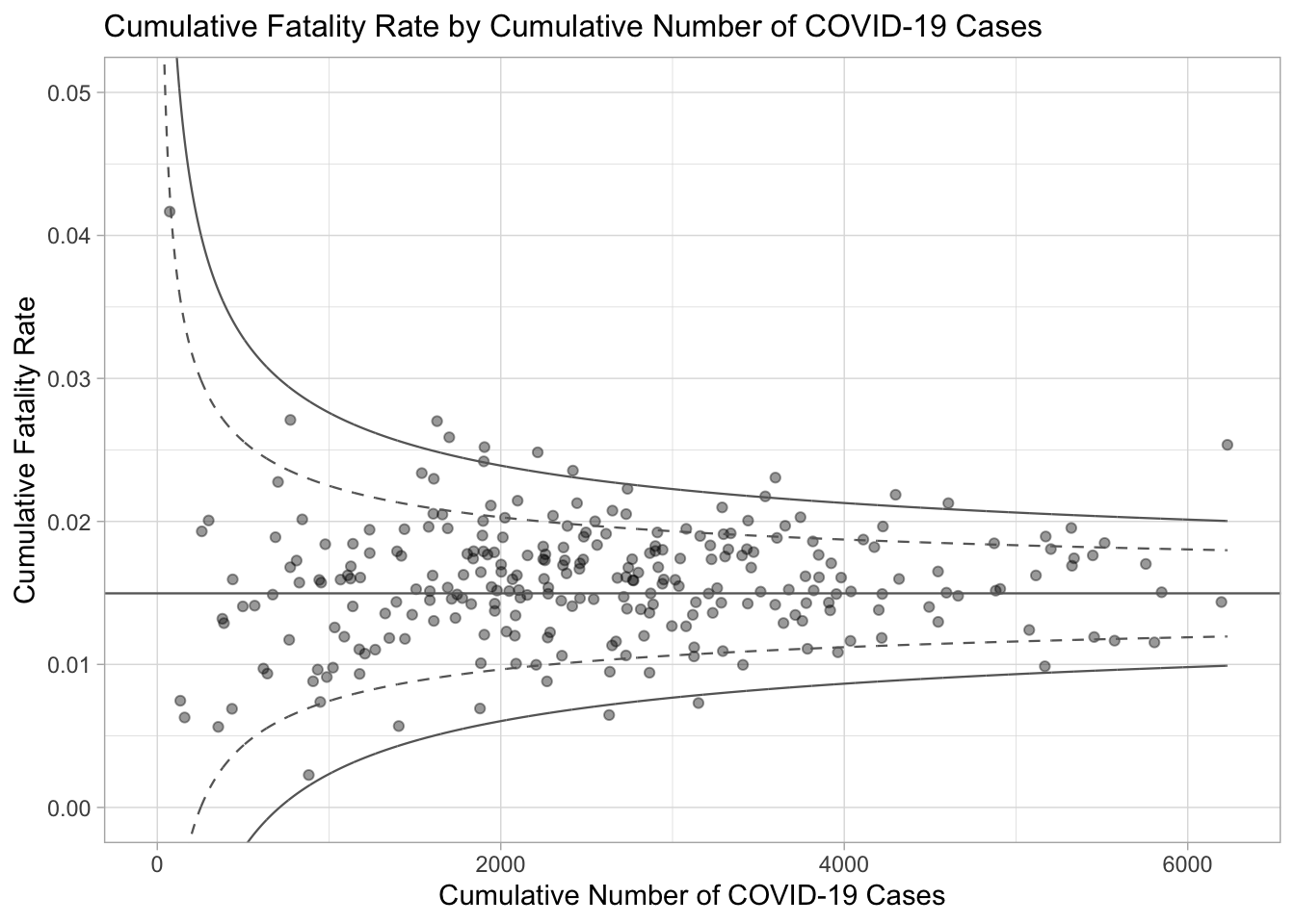 ggtitle("Cumulative Fatality Rate by Cumulative Number of COVID-19 Cases") +