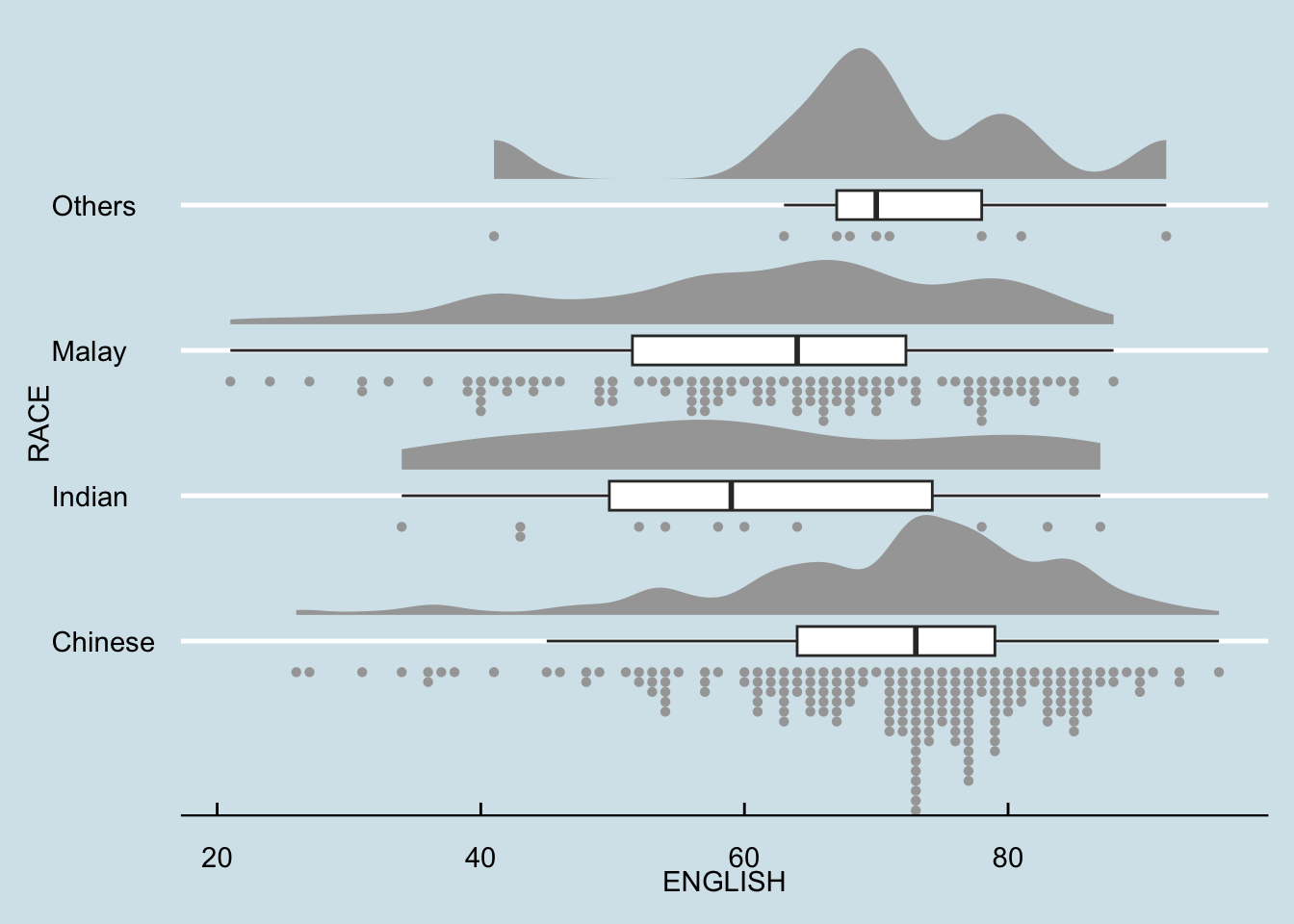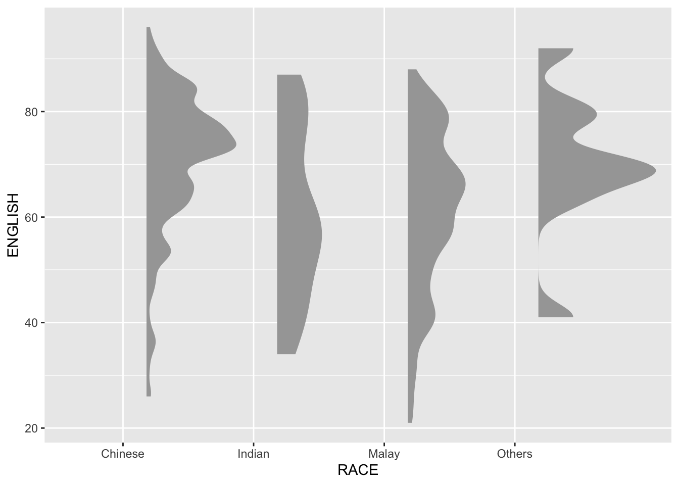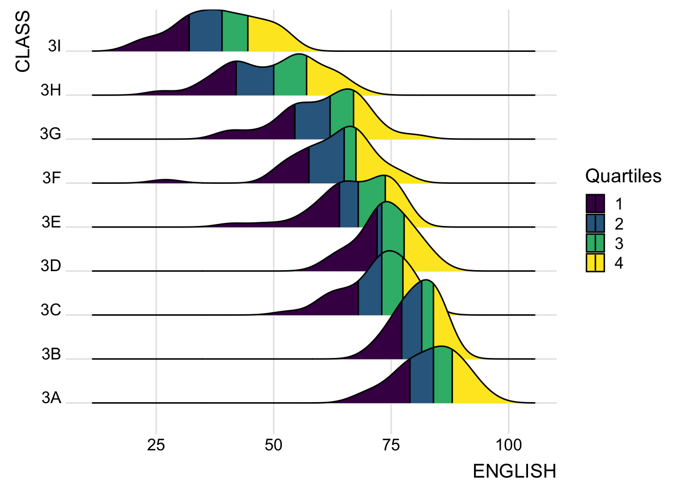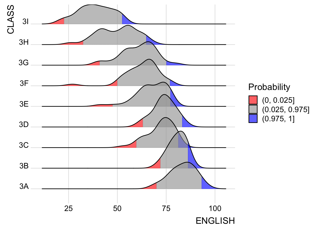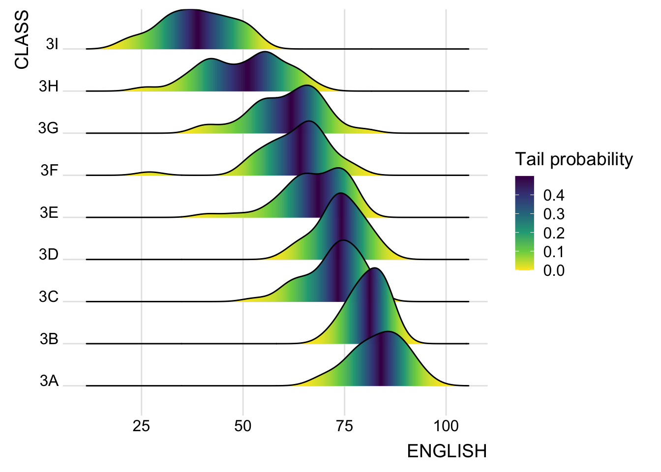 For this particular dataset, it is more appropriate to use geom_density_ridges() as we need to plot the distribution of students’ English score. If we had tallied and aggregated the number of students who scores within score ranges, geom_ridgeline() might be appropriate but it isn’t the case.