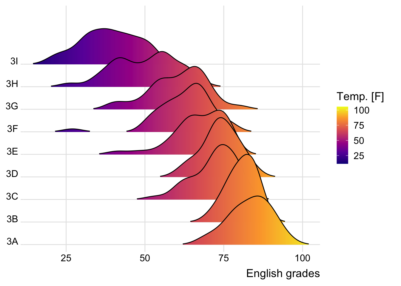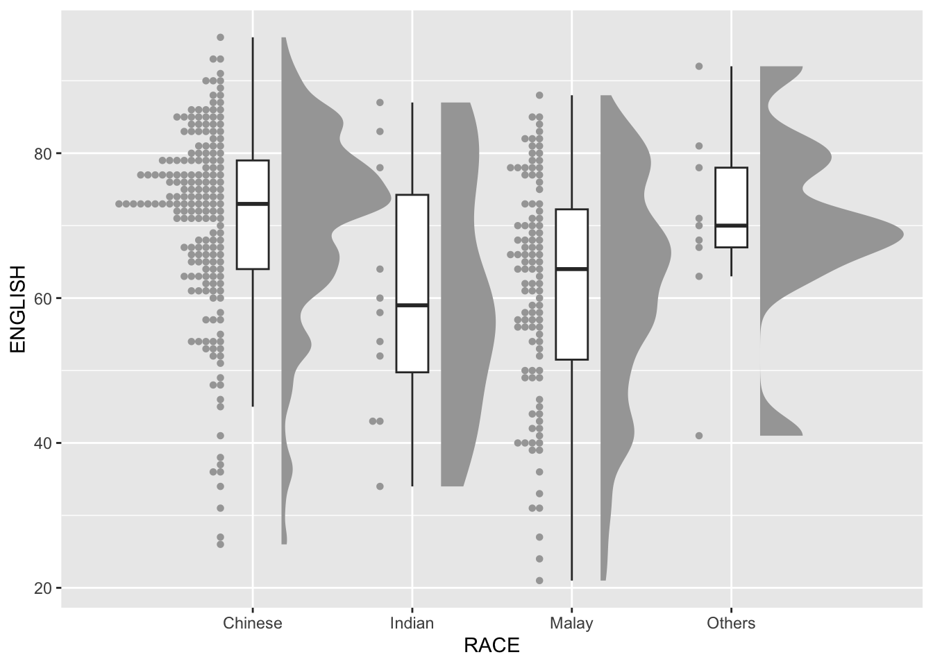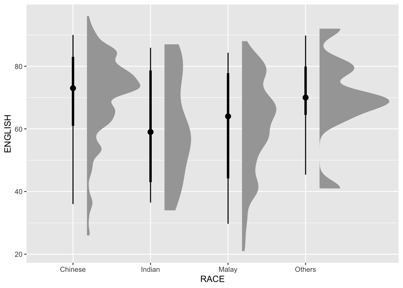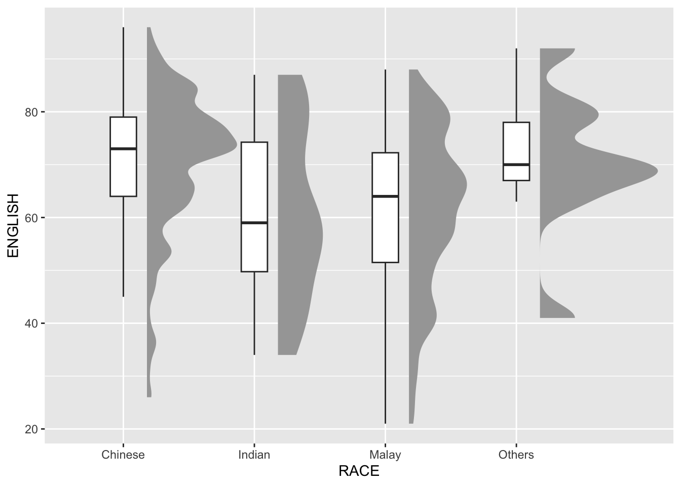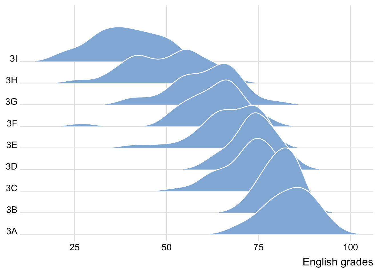For this particular dataset, it is more appropriate to use geom_density_ridges() as we need to plot the distribution of students’ English score. If we had tallied and aggregated the number of students who scores within score ranges, geom_ridgeline() might be appropriate but it isn’t the case.
